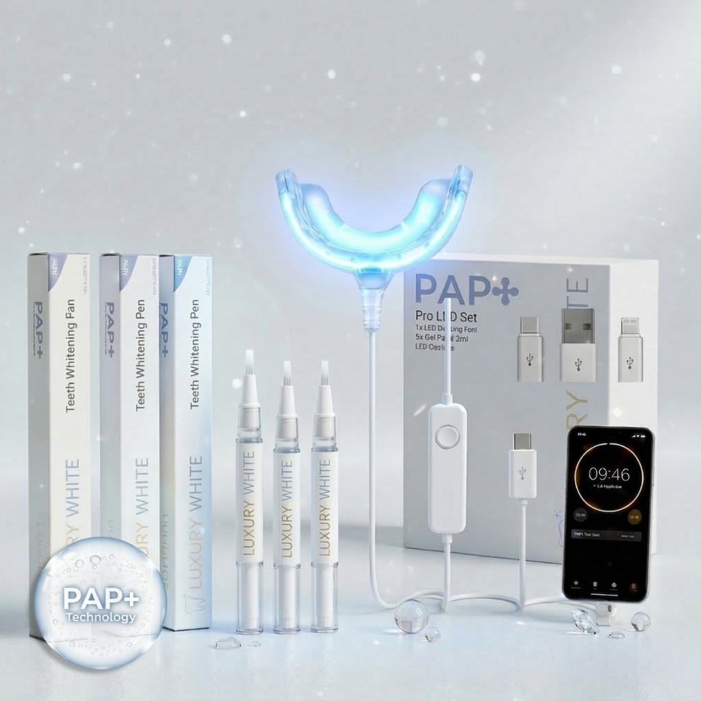 Do you suffer from discolored teeth due to coffee, wine, smoking, or are you simply not satisfied with the whiteness of your smile? The Pro-LED Teeth Whitening Set offers the solution! In just 10 minutes per treatment, you can enjoy radiant white teeth from home, without the high costs of a dental treatment. Thanks to the combination of the powerful PAP+ gel and the professional blue UV light of the Pro-LED, stains and discolorations are removed up to 47% faster with this teeth whitening set.